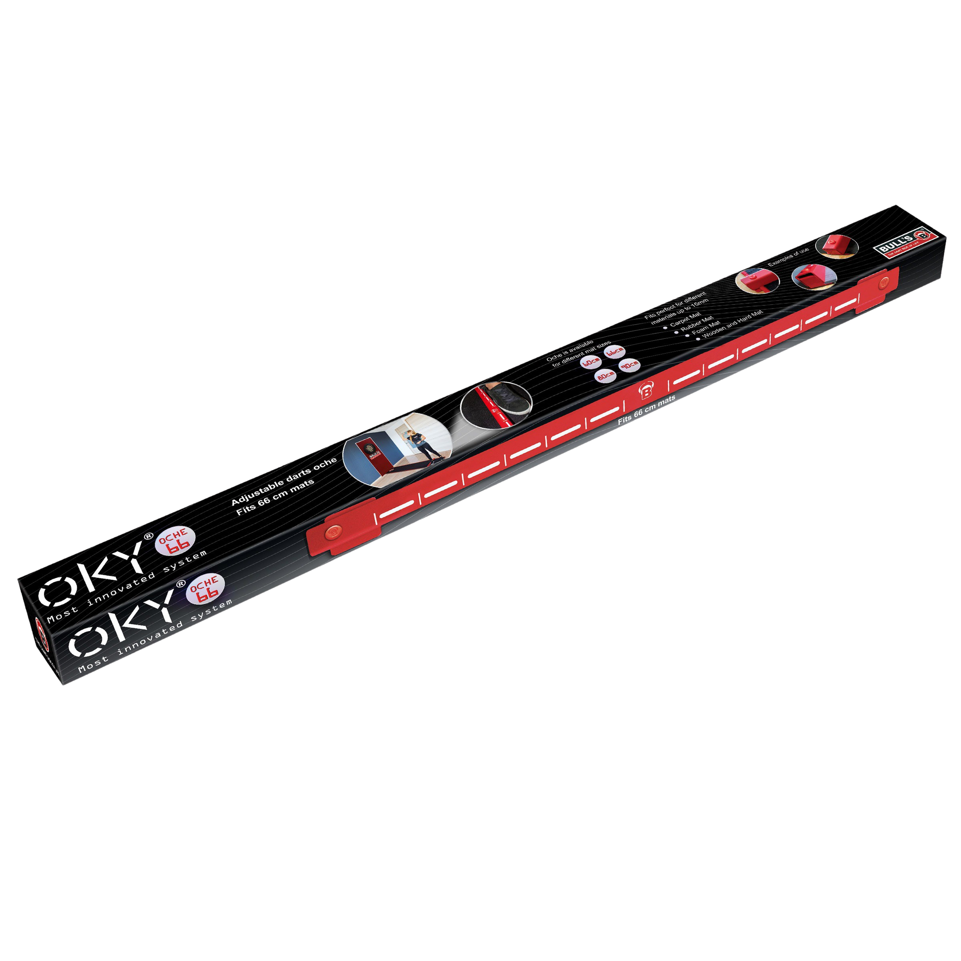 Das BULL'S Oky System ist das innovative Oche System von BULL'S. Das geschützte Oky ist so einfach und doch so genial. Das Anbringen des Oche ist einfacher und die Stabilität höher als je zuvor. Der hochwertige Stahl des Oky garantiert eine lange Haltbarkeit auch bei intensiver Benutzung. Das Design der Oberseite des Oky hilft immer den identischen Standpunkt am Oky zu finden. Das Oky ist flexibel einstellbar und kann mit wenigen Handgriffen an Dartmatten angebracht werden, ohne diese zu beschädigen oder zu verrutschen. Das Oky gibt es in den Längen 60 cm, 66 cm, 80 cm und 90 cm gemäß den gängigen Dartmattenbreiten. Es ist verwendbar für alle Gummimatten, Dartteppiche und Hartmatten mit einer Stärke bis zu 15 mm. Auch erhältlich als Set mit der beliebten BULL'S Carpet Mat. Im Lieferumfang enthalten sind zusätzlich zwei BULL'S Abdeckkappen für die Schrauben, sowie zwei Filzgleiter zum Schutz des Bodens. |
