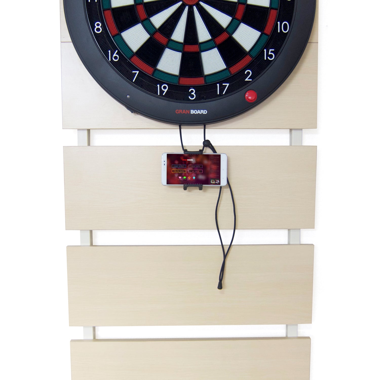 Der Smartphone-Halter kann mit einem Clip an den GRANBOARD Tripod Ständer oder aber auch an einen älteren GRANBOARD Dartständer einfach befestigt werden. Das Smartphone wird sicher befestigt und dient dann als Touchpanel für die App-Steuerung im Match und als Anzeige. |