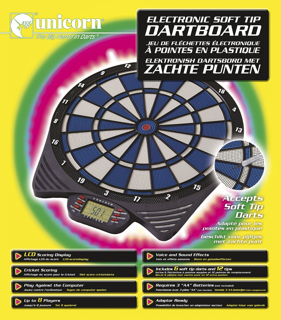 Elektronisches Softtip Dartboard für 8 Spieler mit 25 unterschiedlichen Spielen und 176 Varianten inklusive einer "Spieler gegen Computer" Version. Das Gerät ist mit einer LCD Anzeige ausgestattet, wird mit Batterien betrieben und mit zwei Sätzen Softdarts geliefert.(Batterien sind nicht enthalten) |