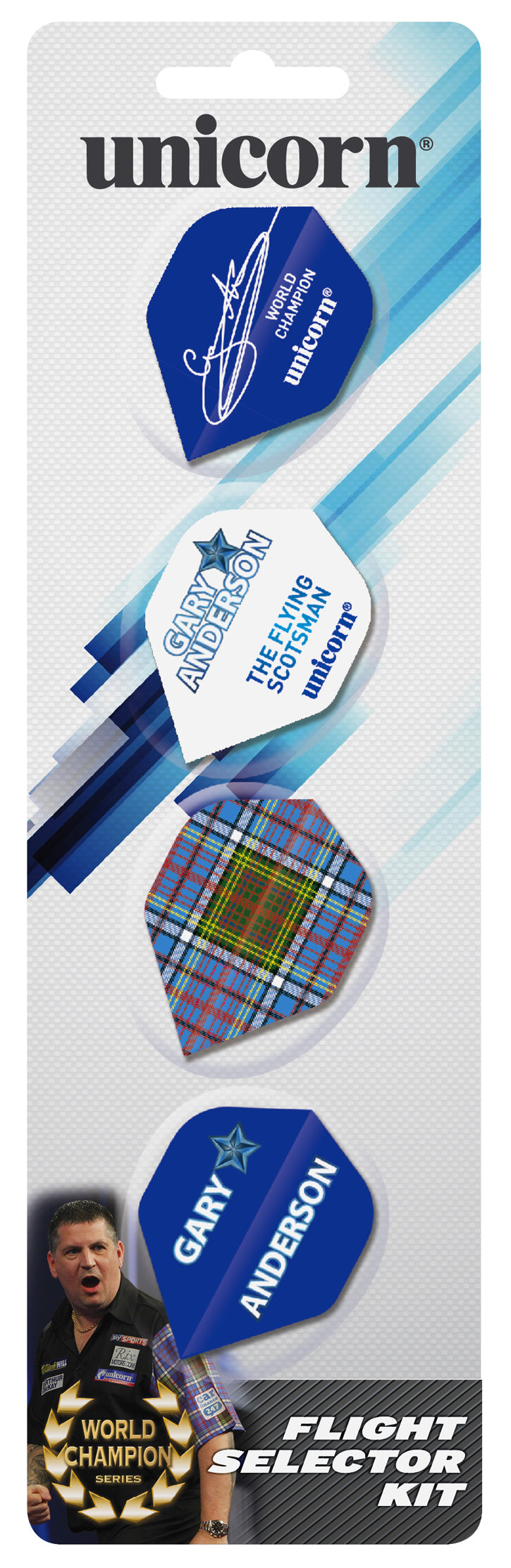 Gary Anderson ist der PDC Dartweltmeister von 2015 und 2016. Unicorn Gary Anderson Flight Sortiment auf einer Blisterkarte. 4 verschiedene Flightsets des Weltmeisters zur Auswahl. |
