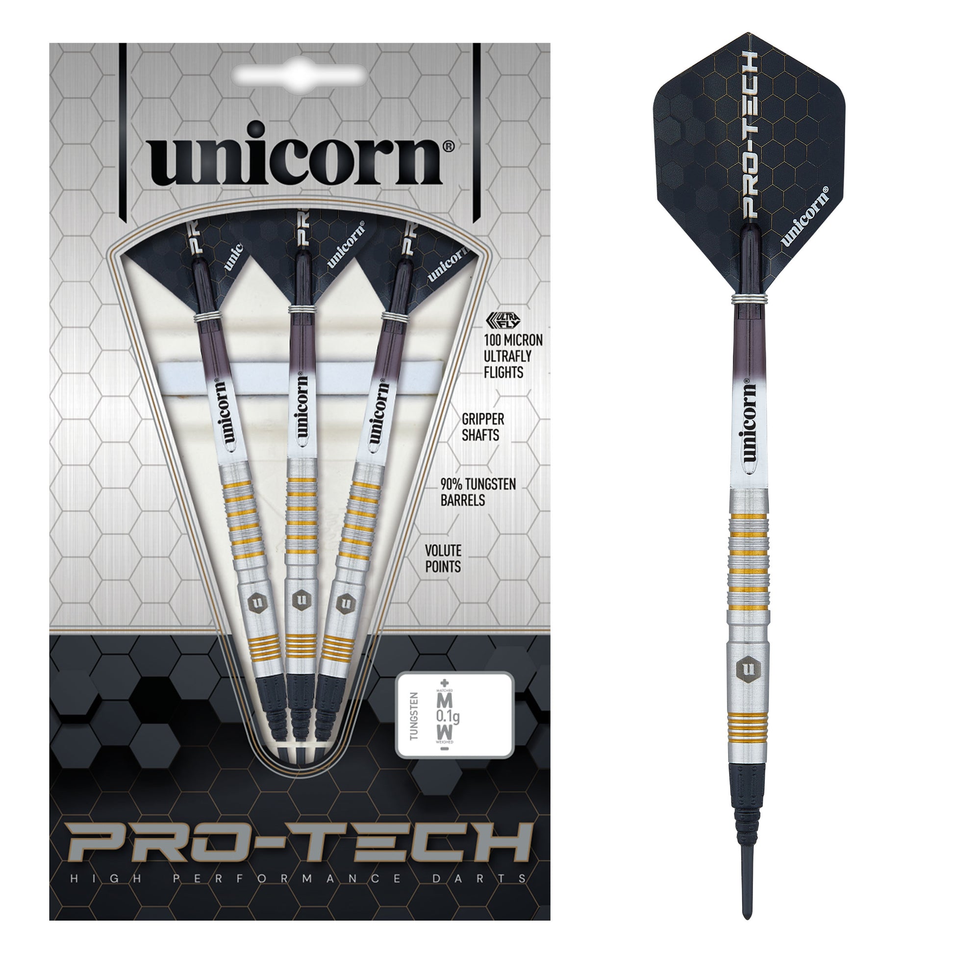 Pro-Tech, Unicorns High Performance Dart für jedermann. Dieser Dart ist eines der absoluten Highlights des Unicorn Launches 2023. Dieser Dart besitzt einen eindrucksvollen Mix aus gold-silbernem Barrel, dem zweifarbigen Gripper Shaft und Schwarzen ULTRAFLY Flight. Diesen Dart gibt es in fünf verschiedenen Barrelvarianten, die garantieren, dass jeder seinen passenden Pro-Tech findet. Die Steel Version besitzt überragende 90 % Tungsten und der Soft-Dart verfügt ebenfalls über einen hohen 70 % Anteil an Tungsten. Selbstverständlich wird ein Gewicht mit einer Toleranz von +/- 0,1g garantiert. Die Steel und Soft Versionen des Pro-Tech sind in diversen Grammzahlen erhältlich. |