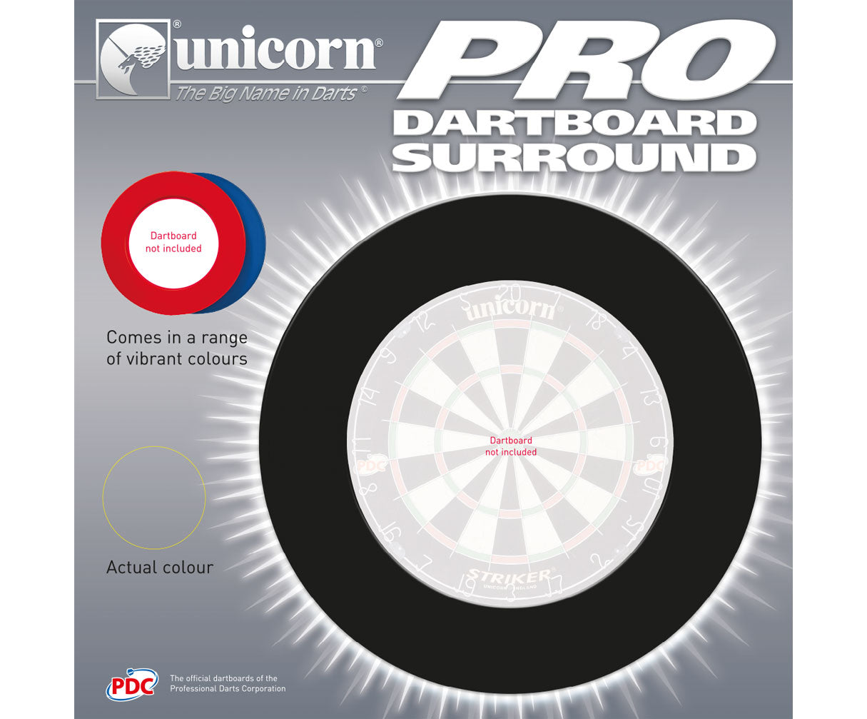 Unicorn Professional Dartboard Surround in Spitzenqualität, wird zum Schutz der Wand wie ein Rahmen auf das Dartboard gesteckt, keine weitere Montage erforderlich. Darts, die knapp neben das Board geworfen werden, bleiben sicher im Surround stecken. Dartboard nicht im Lieferumfang enthalten. |
