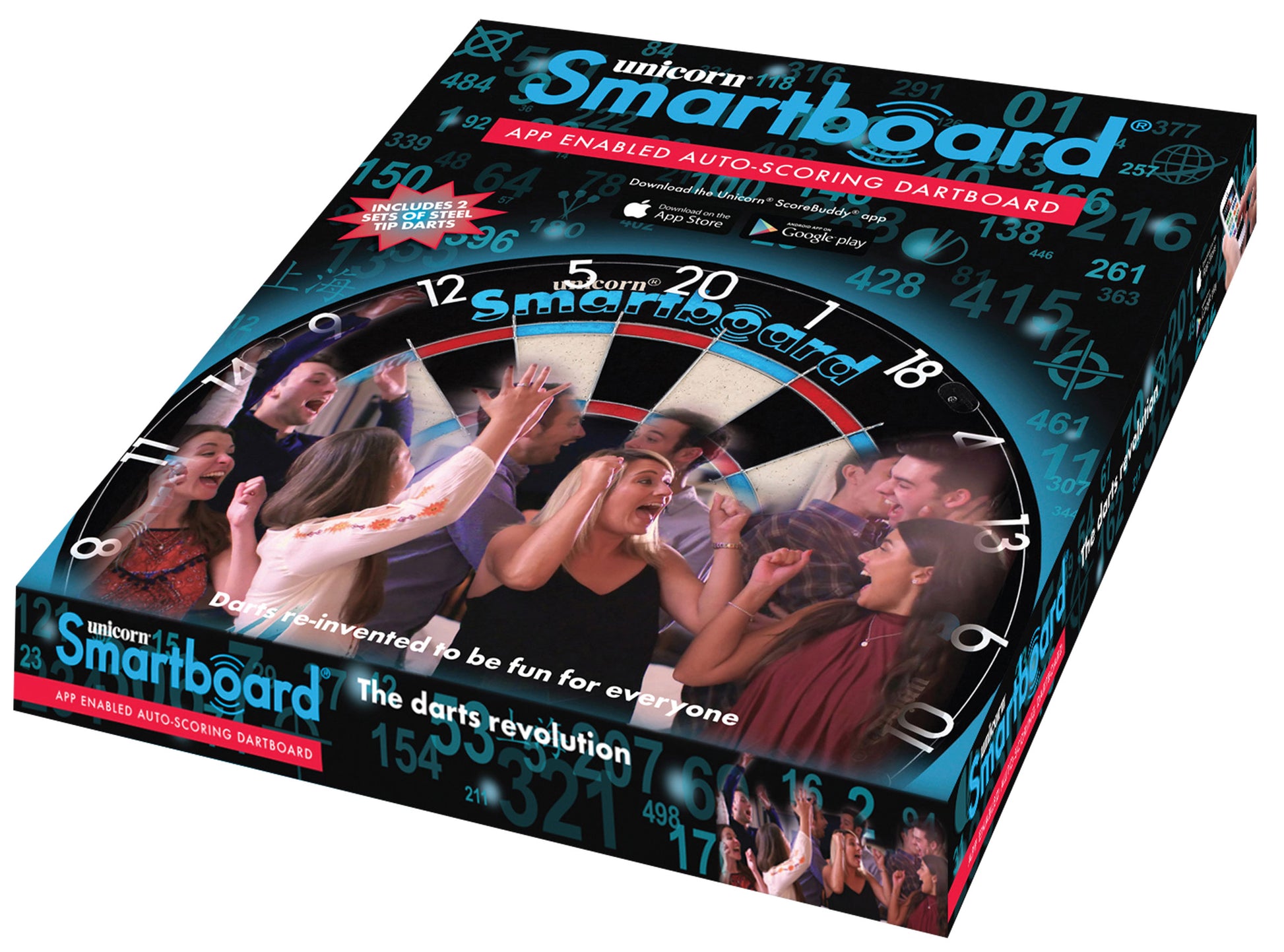 Endlich nicht mehr selbst rechnen oder Zahlen eingeben müssen, viele Dartspieler wünschen sich dieses seit langem. Mit dem Smartboard von Unicorn bricht die neue Dart-Generation an. Dieses Dartboard revolutioniert die Dartwelt, sie ist die erste Dartscheibe, die über eine App gesteuert werden kann und eine direkte automatische Zählung der Punkte ermöglicht. Die Scorebuddy App übermittelt die Punktzahl direkt auf das Handy oder Tablet. Bei der App kann zwischen 8 aufregenden Spielvariationen und bis zu 8 Spielern in 2er Teams oder 4 Einzelspielern ausgewählt werden. Ebenso ist eine Single Player Version verfügbar, bei der gegen die App angetreten wird. Die App kann ebenso einzelne Legs oder Spiele speichern oder auch die persönliche Statistik eines Spielers auswerten. Die Bluetooth LE (Low Energy) Funktechnik benötigt deutlich weniger Strom und hat eine Reichweite von rund 10 Metern. Das Smartboard benötigt 3 x AA Batterien. Im Lieferumfang enthalten sind 6 Steeldarts, diese müssen vor Spielbeginn am Board magnetisiert werden (alle Steeldarts sind für das Smartboard geeignet und können am Board magnetisiert werden). Das Smartboard verfügt zudem über einen drehbaren Zahlenring, dieser verhindert eine einseitige Abnutzung der Dartscheibe und erhöht die Lebensdauer des Boards deutlich. Genauere Informationen finden Sie in der mitgelieferten Bedienungsanleitung. |