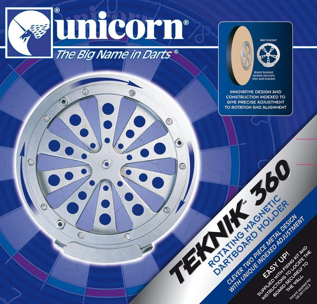 Unicorn Teknik 360 ist ein innovativer patentierter Halter für Bristle Dart Boards. Ein Metallring wird an der Wand, ein weiterer am Dartboard befestigt. Durch die magnetische Wirkung wird das Board sicher gehalten und kann sich nicht mehr verdrehen. Eine Montageanleitung ist im Lieferumfang enthalten. |